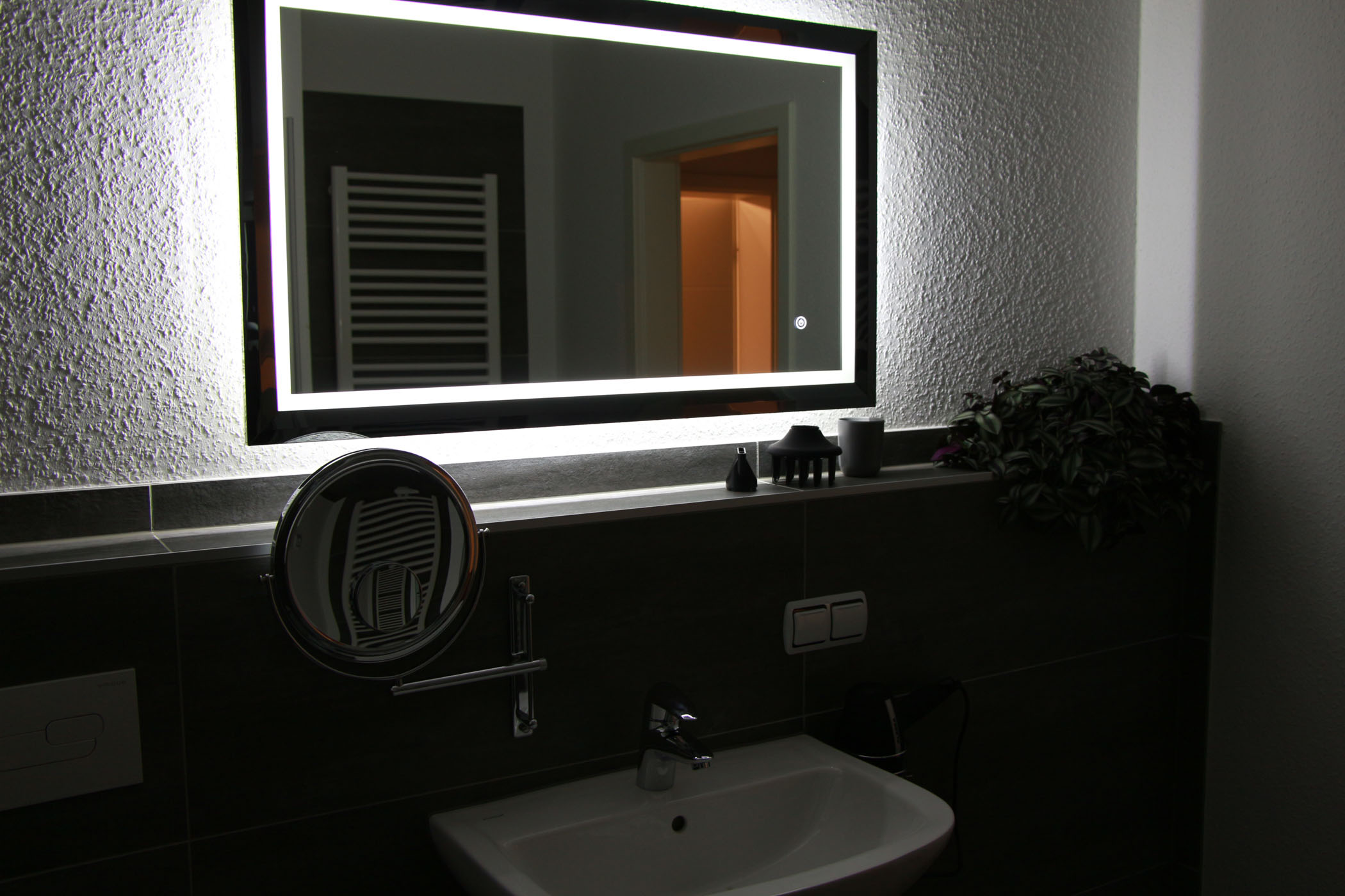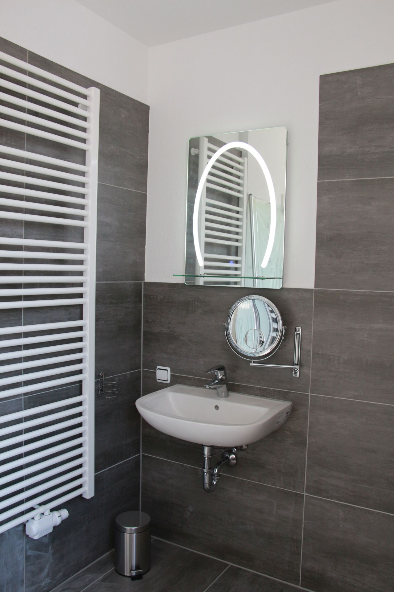 Apartment 2 ist mit Stützgriffen in der Dusche und am WC ausgestattet. Der Spiegel lässt sich neigen, Möbel sind auf Rollstuhlfahrer optimiert.